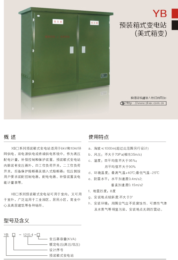 YB預裝箱式變電站適用于6kV和10kV環網供電,雙電源供電或終端供電系統中,作為高壓配電計量,補償控制和保護裝置。預裝箱式變電站內除裝有變壓器外,四工位負荷開關,二工位負荷開關,后備保護熔斷器及插入式熔斷器;低壓側按用戶要求裝配控制電器,配電電器。補償裝置及電能計量表等。