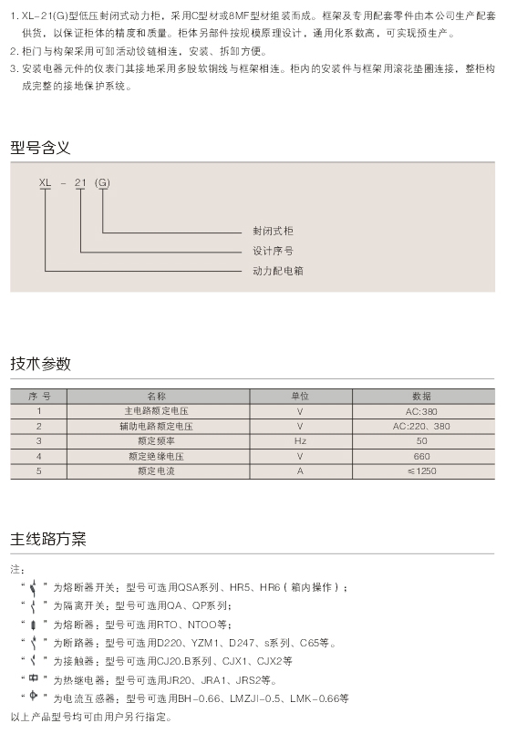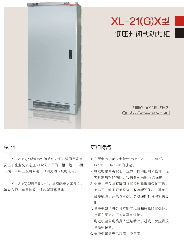 XL- 21(G)X型低壓封閉式動力柜,適用于發(fā)電 及工礦企業(yè)交流電壓500V及以下的三相三線、三相 四線、三相五線制系統(tǒng)。作動力照明配電之用。 XL-21(G)型低壓動力柜,具有配電方案靈活、 組合方便、實用性強、結構新穎等特點。